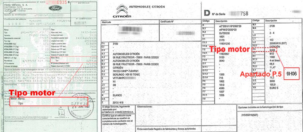 En esta imagen podrá ver en qué apartado de las distintas fichas técnicas del vehículo aparece el tipo de motor.