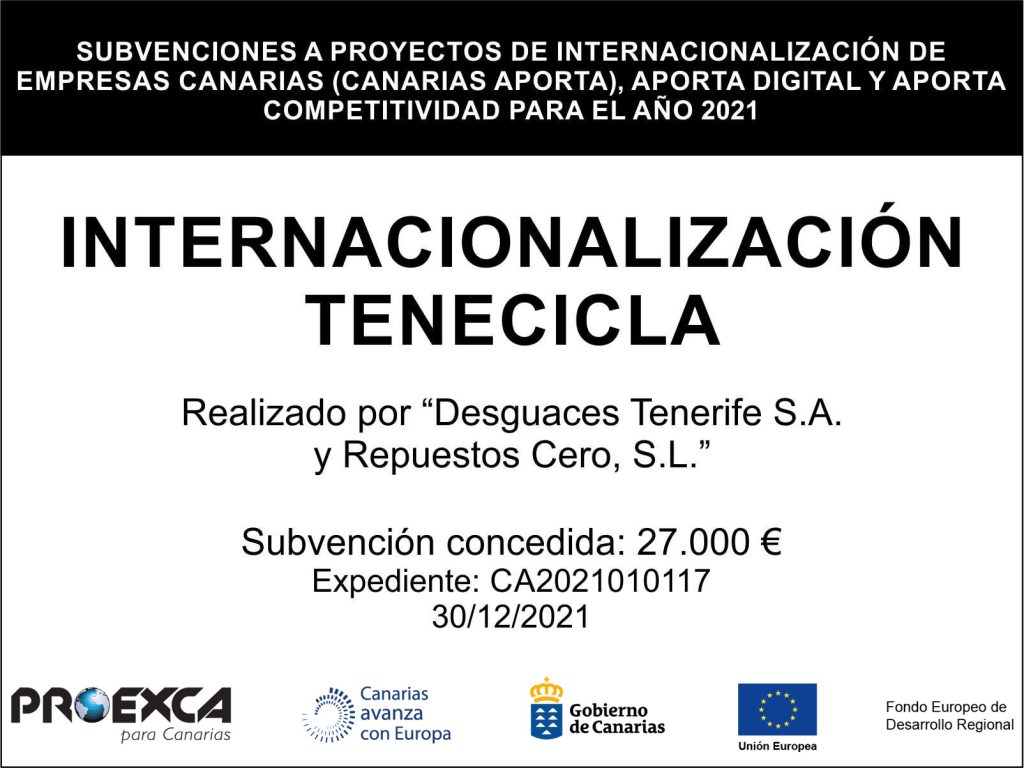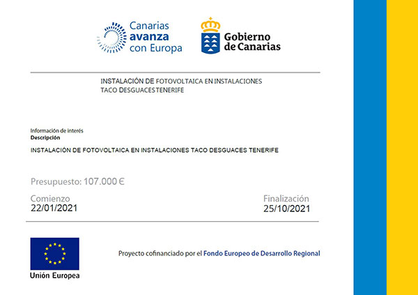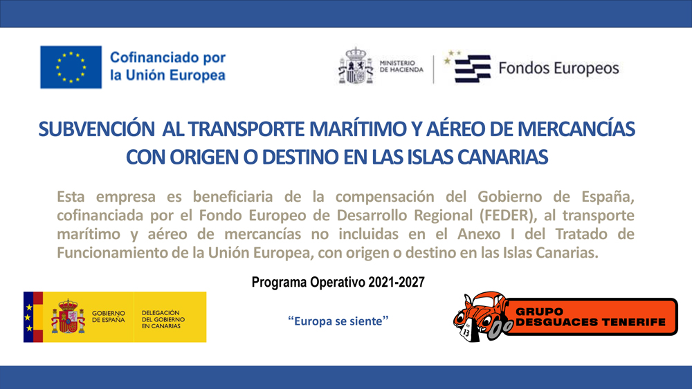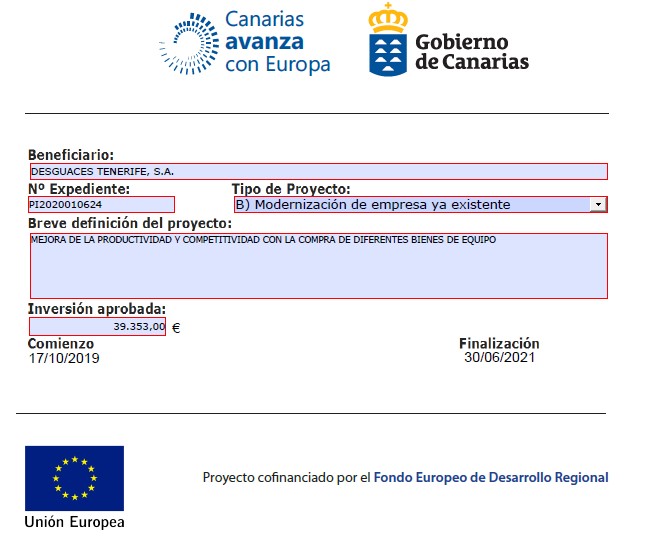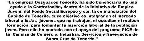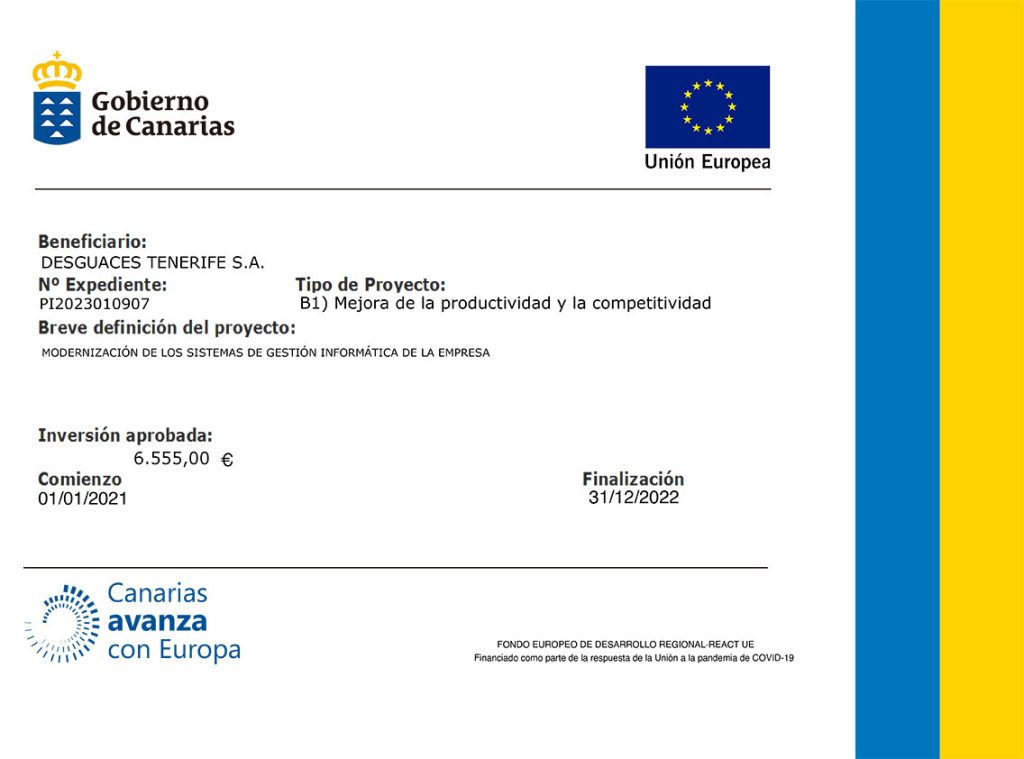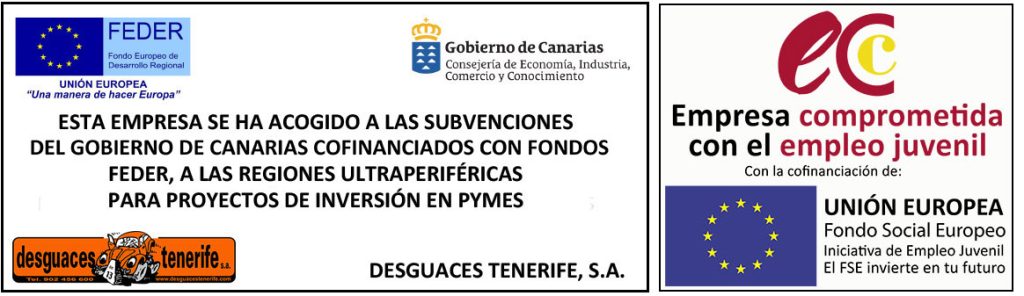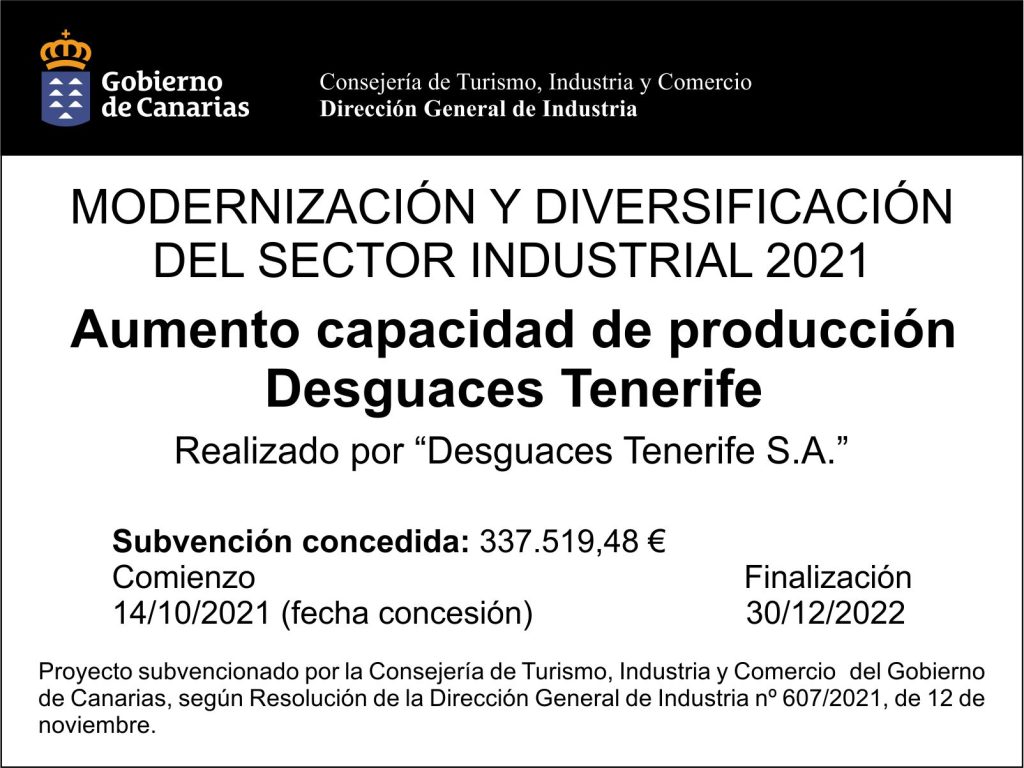 Subvención del Gobierno de Canarias para el aumento de la capacidad productiva de Desguaces Tenerife, S.A. Proyecto subvencionado por la Consejería de Economía, Industria, Comercio y Autónomos del Gobierno de Canarias, según Resolución de la Dirección General de Industria nº 659/2023, de 11 de diciembre.