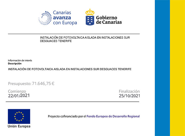 Subvención del Gobierno de Canarias para el aumento de la capacidad productiva de Desguaces Tenerife, S.A. Proyecto subvencionado por la Consejería de Economía, Industria, Comercio y Autónomos del Gobierno de Canarias, según Resolución de la Dirección General de Industria nº 659/2023, de 11 de diciembre.